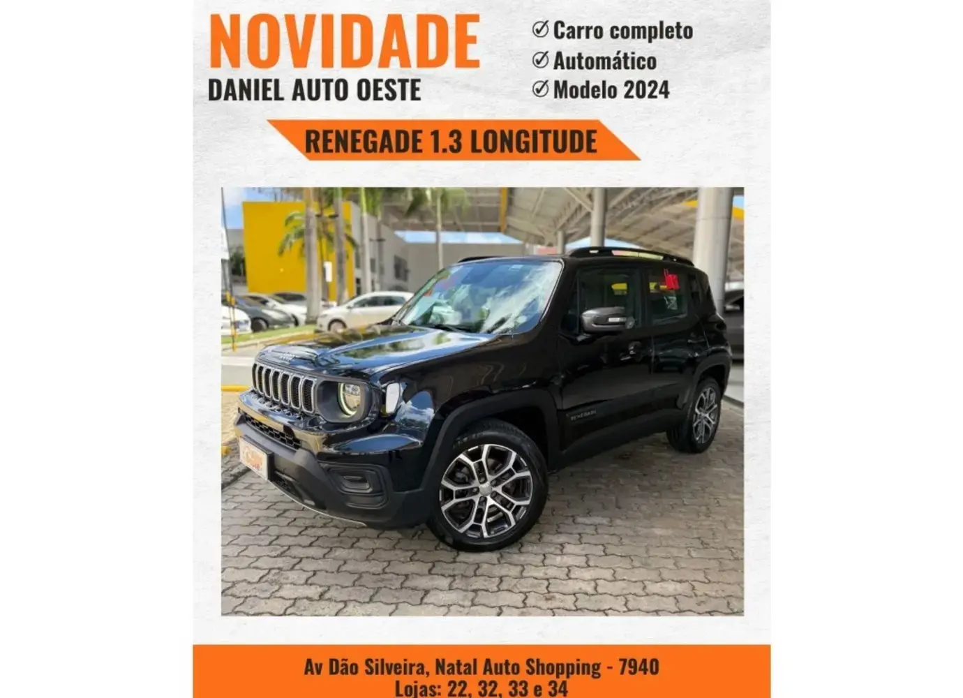 BEM-VINDO À DANIEL AUTO OESTE! Oportunidade!!! JEEP RENEGADE 1.3 LONGITUDE AUTOMÁTICO / 2024 * Veículo REVISADO * KM 42505 * Carro todo original A mais de 23 anos no mercado, (Aqui tem Procedência, Padrão e Qualidade). Daniel Autooeste: Av. Av. Dão Silveira, 7940 - Pitimbú, Natal - RN, 59066-180 - BR 101- ( NATAL AUTO SHOPPING ) Esperamos por você!